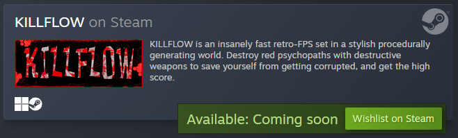 KILLFLOW is an insanely fast psychedelic retro-FPS set in a stylish procedurally generating world. Destroy red psychopaths with destructive weapons to save yourself from getting corrupted, and get the high score.